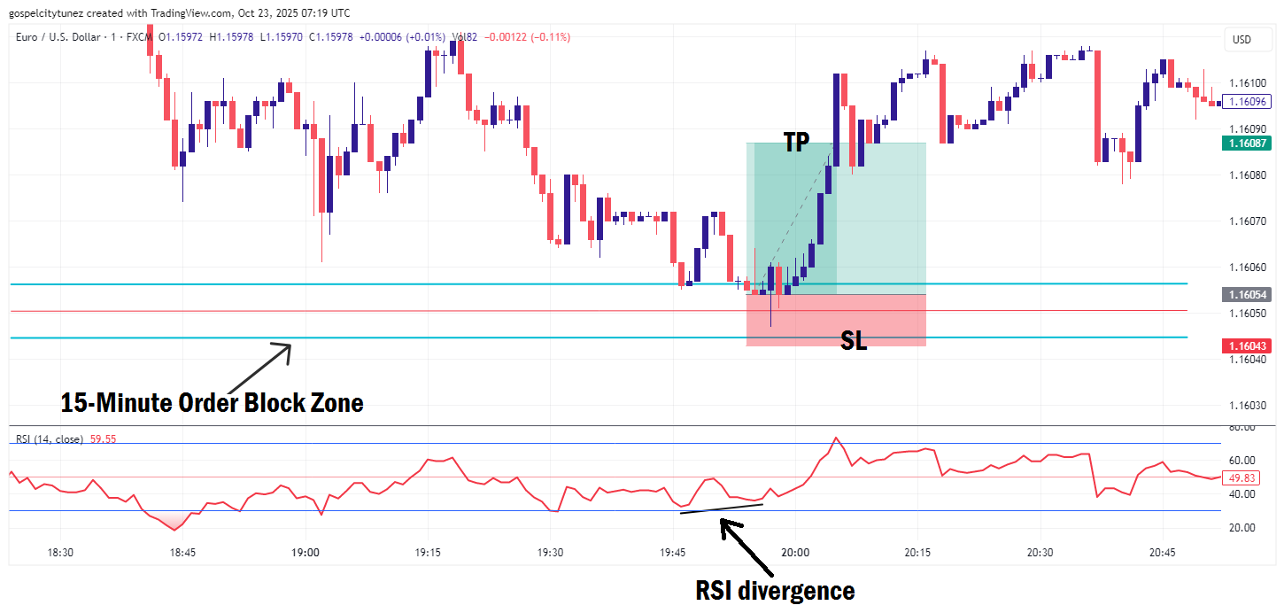 Suppose you’ve marked a bullish order block on the 15-minute timeframe. Then, on the 1-minute chart, you spot a bullish RSI divergence as price taps into your zone.