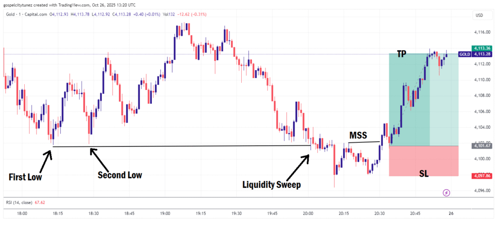 - When price returns to that zone, it sweeps the liquidity, confirms a market structure shift, and reverses upward.